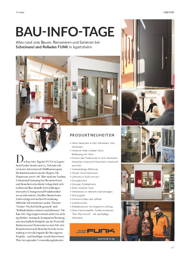 Unser nächster Ausstellungs-Samstag ist der 25.04.2026. Bitte vereinbaren Sie mit uns einen Beratungstermin. Wir nehmen uns für Sie Zeit und beraten Sie individuell bei einer Tasse guten Kaffees. Besuchen Sie uns in der FUNK-Erlebniswelt in Irgertsheim!